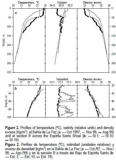 The typical profiles of the outer sections of the bay (Espíritu Santo Shoal) are shown in figure 2b. The temperature distributions are similar for all the stations and do not show a mixed surface layer. The salinity profiles in some stations show more saline layers related to intrusion of other water caused by the complicated topography of the marine mountain of the Espíritu Santo Shoal, located between two deep canyons. Salinity in the intrusion layers has values up to almost 36.0 and the density profiles have unstable layers at the same depths.