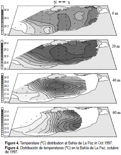 The horizontal temperature distributions for the same horizons in October 1997 are shown in figure 4. As in August, the surface temperature in the western part of the mouth was colder (<29.0°C) than in the eastern one (>29.4°C). Waters with temperatures similar to the latter extended from the entrance of the San Lorenzo Channel to the inside of the bay. There were two zones of maximum temperature, the largest one was in the center (> 29.4°C) and the other one was found at the head of the bay (>29.5°C). At 20-m depth, the distribution had a trend similar to that at the surface with the nucleus growing in the center. At 40-m depth, in the eastern extreme of the main mouth there was an intense horizontal temperature gradient with a temperature difference of 1.6°C (possibly because of a thermocline uplifting). The nucleus of maximum temperature remained in the center of the bay in front of the islands. In the 60-m depth distribution of temperatures, the warm central nucleus does not exist but it is replaced by a South-North gradient.