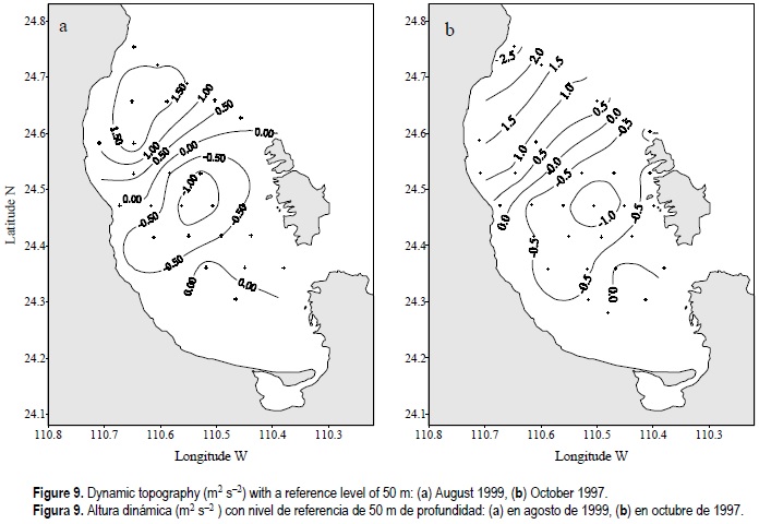 In October 1997, a lens of warm water was located at the surface layer in the center of the bay (< 50 m depth) (fig. 4). Its location is evident by the concavity in the vertical sections (fig. 6). This pattern of isopycnics is usually related to a anticyclonic vorticity structure (Stern, 1975) caused by density currents along with the topography of the bay. This vorticity can persist because of the input flow in the western part of the mouth that forms a meander at the height of line 3 and exits through the eastern part of the mouth.