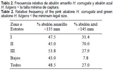 La composición por tallas y edades se determinó para una área de 6,146,745 m2 en la franja litoral entre 1 y 18 m de profundidad. Se definieron 54 bloques en los cuales se realizaron 504 inmersiones, se obtuvo un total de 1549 abulones distribuidos en cuatro estratos (tabla 1), y se definió el porcentaje de cada estrato respecto al área total. El 31.6% correspondió a H. corrugata y 68.4% a H. fulgens. En la franja de 1 a 7 m se realizaron el 53% de las inmersiones, en la de 7.1 a 14 m el 35.2%, y en la de 14.1 a 18 m el 11.7%. El tipo de sustrato o hábitat efectivo del abulón fue roca alta, roca plana de grandes extensiones (de 15 a 40 m), grava, y roca con cuevas.