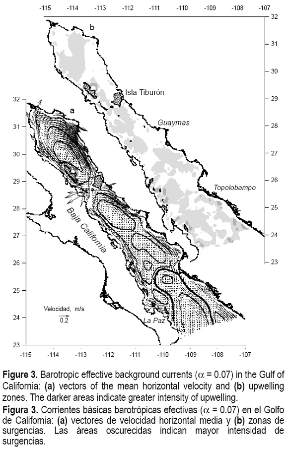 We now compare the calculated effective BC pattern (fig. 3 a) in the Gulf of California with prevalent concepts about the character of circulation in this region. An anticyclonic movement of considerable speeds occupies the northern part of the gulf. The presence of this permanent gyre, which in a longer winter has anticyclonic rotation, is confirmed by the analysis of hydrological observations and direct measurements (e.g., Lavín et al., 1997b). Most numerical models reproduce this gyre. In a shorter summer, however, the direction of currents (as well as wind) reverses due to seasonal variability in the basic geophysical parameters of this generally shallow region (e.g., Carrillo et al., 2002).