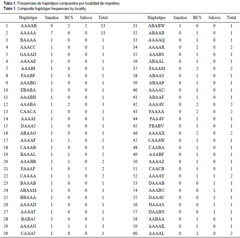 El tamaño del fragmento amplificado fue de 1350 pares de bases. Todas las enzimas fueron polimórficas y los sitios de restricción por enzima variaron de 2 en SspI hasta 22 en MseI, encontrándose un total de 41 patrones de restricción. Se observaron un total de 60 haplotipos compuestos entre los 100 organismos analizados (tabla 1), de los cuales 31 se presentaron en Sinaloa, 32 en Baja California Sur (BCS), y 9 en Jalisco. Los haplotipos dominantes (1 y 2 en tabla 1) se encontraron en el 26% de los organismos; en BCS predominó el número 2 mientras que en Sinaloa ambos fueron abundantes (tabla 1). Sinaloa y BCS presentaron casi el mismo número de haplotipos únicos, mientras que sólo 2 de los 60 haplotipos fueron encontrados en las tres localidades. Las diversidades medias haplotípica (0.966) y nucleotídica (3.23%) fueron elevadas, presentando Jalisco los valores más altos y Sinaloa los más bajos (tabla 2). El número limitado de muestras procedentes de Jalisco obliga a interpretar con cautela las estimaciones de diversidad de esta población.
