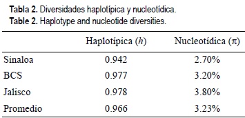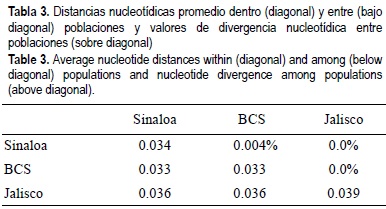 La divergencia entre poblaciones fue muy baja, alcanzando tan solo un máximo de 0.004% entre Sinaloa y BCS (tabla 3). Las distancias medias interhaplotípicas dentro de cada localidad promediaron 0.036, incluyendo a Jalisco, y fueron muy similares en Sinaloa y BCS (0.034 y 0.033, respectivamente), consecuentemente las distancias medias entre ambas localidades y Jalisco fueron iguales (0.036, tabla 3).
