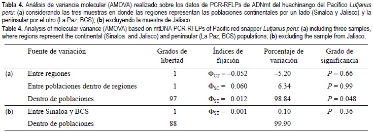 El AMOVA demostró que las fracciones de la variabilidad genética atribuibles a diferencias entre las dos poblaciones continentales y la peninsular, o a las poblaciones dentro de cada región, no son significativas (Φct = -0.052, P = 0.66; tabla 4a). Sin embargo, el índice Φst obtenido fue marginalmente significativo (Φst = 0.0116, P = 0.048). La exclusión de la muestra de Jalisco en el AMOVA corroboró la ausencia de diferenciación molecular entre los organismos de Sinaloa y BCS (Φst = 0.001, P = 0.36; tabla 4b), lo que confirma que la inclusión o exclusión de estos organismos (n = 10) no afecta el resultado principal de los análisis de estructura genética.