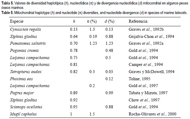 Los valores de diversidad haplotípica y nucleotídica mitocondrial de L. peru fueron altos. No obstante, puesto que diferentes regiones del ADNmt presentan distintas tasas de evolución (Randi, 2000), la comparación directa con otros resultados no es tan evidente. En principio, dichas comparaciones deberían de hacerse sobre la región de control ortóloga de otras especies. Además, la utilización de diferentes herramientas moleculares puede dar también diferentes valores de diversidad para una misma región del genoma. En el caso de los RFLPs, los valores de diversidad aumentan con el número y el tipo de enzimas utilizadas (Graves et al., 1992a), aunque esta relación no siempre se verifica ya que pueden encontrarse enzimas hipervariables como MseI para la región de control de L. peru. En general, la diversidad molecular del huachinango fue mayor que la observada en otros peces en RFLPs de toda la molécula del ADNmt (Graves et al., 1992a, 1992b; Grijalva-Chon et al., 1994; Gold et al., 1997) (tabla 5). Esto puede ser explicado por la diferencia entre la tasa de evolución media de todo el genoma mitocondrial y la de la región de control (Brown et al., 1993). Sin embargo, los valores de diversidad reportados en estudios en los que se ha utilizado todo el ADNmt tales como los de Gold et al. (1994), para tres especies de peces marinos, y los de Camper et al. (1993), para el huachinango del Golfo de México, son parecidos a los observados en ese trabajo. Cabe notar que, si bien la mayoría de los estudios en los que se ha utilizado exclusivamente la región control también han producido altas diversidades (e.g., Graves y McDowell, 1994; Chow et al., 1997; Tabata y Mizuta, 1997), en ellos se ha usado un mayor número de enzimas de restricción (8 a 13), por lo que los valores aquí reportados obtenidos con cinco enzimas pueden ser considerados excepcionalmente altos. En efecto, valores de magnitud comparable son más típicamente obtenidos a partir de secuenciación directa de toda la región de control (e.g., Rocha-Olivares et al., 2000).