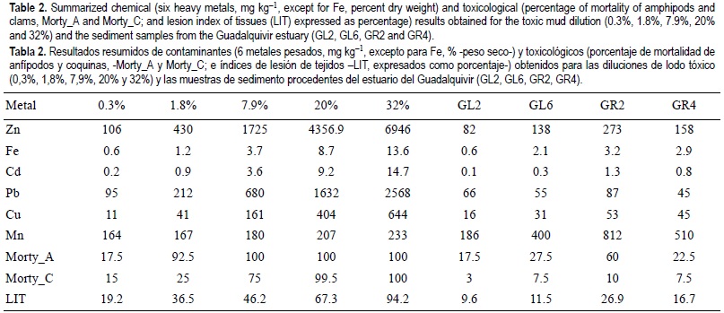 The present study was performed at four stations (GL2, GL6, GR2 and GR4) in the Guadalquivir estuary, SW Spain (fig. 1). Toxic mud was collected from an impacted area, located 40 km away from the Aznalcóllar mine tailing pond. The mud was diluted by a clean sediment from the Bay of Cádiz (fig. 1) to yield concentrations of 0.3%, 1.8%, 7.9%, 20% and 32% dry weight. The dilutions were performed in the containers for the toxicity tests. The mixtures were homogenized in water to be used in the tests. A detailed description of the dilution procedures, the collection of the samples, the chemical analysis and the toxicity tests are reported by Riba et al. (2002b). A summarized description of these processes and techniques is shown in table 1.