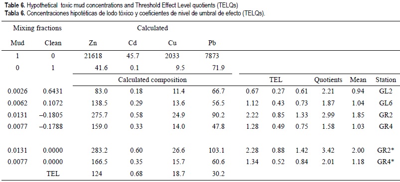 Assuming that the sediments in the estuary were contaminated by only the toxic mud, the hypothetical concentration of the toxic mud in these samples can be calculated (table 6). The agreement between the calculated and the reported concentrations is not perfect, but it gives an estimate of the concentration of the toxic mud that approximates the concentrations of metals in the samples from the estuary. Interestingly, the agreement between the reported (table 2) and calculated (table 6) concentrations is better for the more distant stations GL2 and GL6. The concentration of Cu and Cd is underestimated in the GR2 and GR4 samples. Nevertheless, one can use the calculated (or expected) toxic mud concentrations in a comparison with the results of the toxicity tests (fig. 3). Since there are only two "spiked" sediment concentrations within the hypothetical concentration range (0.2-1.3%, table 2), the toxicity curves in the range of the calculated concentrations were obtained by interpolation. As can be seen from figure 3, most of the expected frequency of toxic effects is well below the extrapolated toxicity curves, particularly for clams.