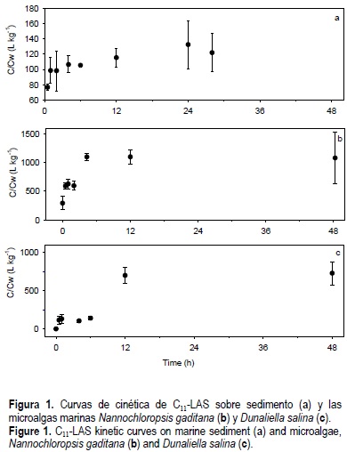 La evolución temporal del cociente entre la concentración de C11-LAS en el material en suspensión y en el agua se muestra en la figura 1. Se observa como en las primeras horas de exposición hay un aumento rápido alcanzándose el equilibrio en torno a las 8-12 horas, tanto para los sedimentos como para ambas algas. Tiempos similares han sido descritos en la bibliografía para sedimentos marinos (Rubio et al., 1996), y para el alga Gracilaria debilis (Fernández et al., 1995; Fernández et al., 1996). La figura 2 muestra la evolución del C11-SPC para sedimento (fig. 2a) y ambas algas (fig. 2b, c). Se observa la misma tendencia que para el LAS aunque los coeficientes de concentraciones son menores, lo que concuerda con el mayor carácter polar de los SPC. Los tiempos para alcanzar el estado estacionario son superiores a los observados para el LAS, siendo necesarias unas 12 horas de exposición para D. salina, mientras que N. gaditana y el sedimento necesitan un tiempo mayor de exposición, de 18-20 horas. La adsorción de SPC por el material en suspensión presenta un rápido aumento inicial y una estabilización más lenta.