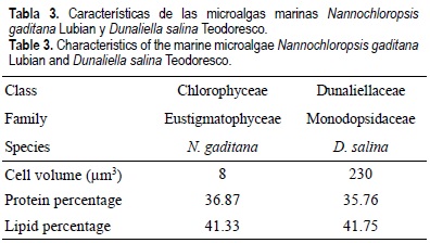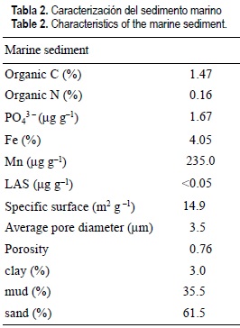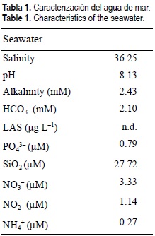 El agua de mar empleada, libre de contaminación y cuyas características se muestran en la tabla 1, procede de una zona externa al área de la Bahía de Cádiz, situada al Sur de España. El agua fue tomada a 1 metro de profundidad a más de 12 millas de la costa (Golfo de Cádiz), filtrada a través de filtros GF/F Whatman de 45 micras y esterilizada con unidades de purificación por vacío Sterivac-GP10 (20 micras). El sedimento ha sido recogido en una antigua salina de la Bahía de Cádiz que, tras su uso, se mantuvo sin recibir aporte alguno de agua, y por tanto, tampoco ha recibido residuos urbanos o de cualquier otro tipo. Tras su muestreo, el sedimento fue secado a 80°C, molturado y tamizado por 300 µm. La tabla 2 muestra sus principales características. Las microalgas empleadas fueron dos especies de algas verde: Nannochloropsis gaditana Lubián, especie autóctona de la Bahía de Cádiz, procedente de la colección de microalgas marinas del Instituto de Ciencias Marinas de Andalucía perteneciente al Consejo Superior de Investigaciones Científicas; y Dunaliella salina Teodoresco, procedente de un cultivo desarrollado en la Planta de Cultivos Marinos de la Facultad de Ciencias del Mar y Ambientales de la Universidad de Cádiz. Las características más relevantes de ambas especies se muestran en la tabla 3.