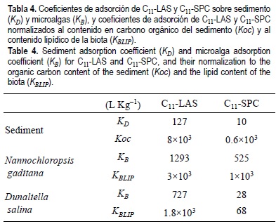 Una vez alcanzado el equilibrio, se establecieron los coeficientes de partición sedimento/agua (KD) y biota/agua (KB) para el C11-LAS y para el C11-SPC, los cuales indican la afinidad del compuesto por la fase sólida (sedimento, en el primer caso, y organismo en el segundo). Teniendo en cuenta el carácter hidrófobo de estos compuestos es necesaria la normalización de los coeficientes con respecto al contenido en carbono orgánico para el sedimento, obteniéndose el Koc (coeficiente de partición obtenido expresando la concentración en sedimento en términos de carbono orgánico), mientras que el coeficiente de partición biota/agua (KB) se normaliza al contenido en grasas, obteniéndose el KBLIP (coeficiente de partición obtenido expresando la concentración en biota en términos de la fracción lipídica). Los resultados obtenidos se muestran en la tabla 4. El LAS es un compuesto lipofílico, cuyo coeficiente de partición octanol agua, Kow, está en torno a 102, por lo que presenta una cierta afinidad por la materia orgánica del sedimento, como muestra el Koc, cuyo valor es 8x103, así como por los lípidos de las microalgas, que poseen KBLIP de 2x103 y 3x103 para D. salina y N. gaditana, respectivamente. Los coeficientes de adsorción, aunque del mismo orden, son ligeramente superiores en sedimento que en las algas. Dentro de las algas, los valores observados para D. salina son inferiores a los obtenidos para N. gaditana. Esta diferencia puede deberse al tamaño mucho menor de esta última, que le confiere una mayor relación superficie/volumen, así como a la presencia de una pared celular de la que Dunaliella carece y que, al tener distinta composición, tendrá también distintas características quimicofísicas.
