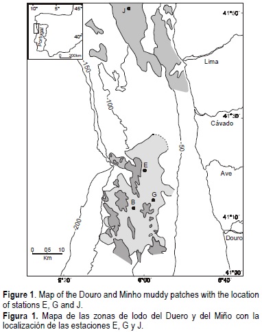 Three sediment cores were sampled in two muddy patches located offshore the Douro and Minho rivers, in the northern Portuguese Shelf (fig. 1). The samples were collected using a multi-corer aboard the research vessel Mestre Costeiro in 1998. Cores E and G, 30 cm long, were collected from the Douro muddy patch and core J, 15 cm long, from the Minho patch. The cores, not disturbed by the sampling, were sub-sampled on board into 0.5-cm horizontal layers in the first 10 cm and then in 1-cm intervals. Deeper sediments were sectioned in 2-cm layers. A 1-g sediment aliquot was separated immediately for sulphide and amorphous iron determinations. All these operations were done quickly in order to minimize changes resulting from the exposure of the sediment slices to the atmosphere. Samples were stored in leakproof polycarbonate tubes, completely filled in a glove box under nitrogen, and kept in a refrigerated chamber. In the laboratory, samples were centrifuged for 30 min at 3000 rpm and 4°C to separate the pore water from the solid phase. The resulting pore water was filtered through 0.45-µm Millipore filters, acidified to pH 2 (1% equivalent volume of ultrapure HNO3) and stored at 4°C. The sediment samples and the cakes of centrifuged sediment were placed in plastic bags and kept frozen at -20°C.