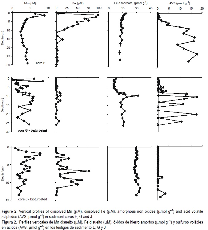 The vertical distributions of total dissolved iron and manganese in sediment pore waters and of AVS in the three cores are shown in figure 2. The manganese and iron profiles in core E are characterized by regular shapes with maximum values below the sediment-water interface. The concentration peaks indicate the oxide reduction near the surface and the subsequent decreases with the removal of these elements from the solution with depth. The vertical distribution of the iron extracted by the ascorbate method elucidates the depth where iron amorphous oxides are formed (Anschutz et al., 1998). Whereas in core E iron precipitated just below the sediment-water interface, the iron oxide peak in core G was formed in the sub-surface layers where several maxima and minima of dissolved iron are present. The values of iron oxides in core J were uniform with depth. The AVS levels increased with depth as dissolved iron in pore waters decreased, which confirms the removal of iron from solution. Manganese and iron in pore waters of cores G and J showed irregular shapes with successive maxima and minima. The manganese maximum occurred in sub-surface layers and iron increased in deeper sediment layers, between 5 and 13 cm. Whereas manganese concentrations were similar in the three cores, iron in pore waters of core E exceeded ten times the values found in core G. The AVS values were low (<0.01 µmol g-1) in the first 5 cm and then increased, showing multiple peaks in core G. Levels of AVS were uniformly low (<0.01 µmol g-1) along core J, except in two layers, around the 8 and 13 cm depths, where concentrations were ten times lower than values recorded in cores G and E.