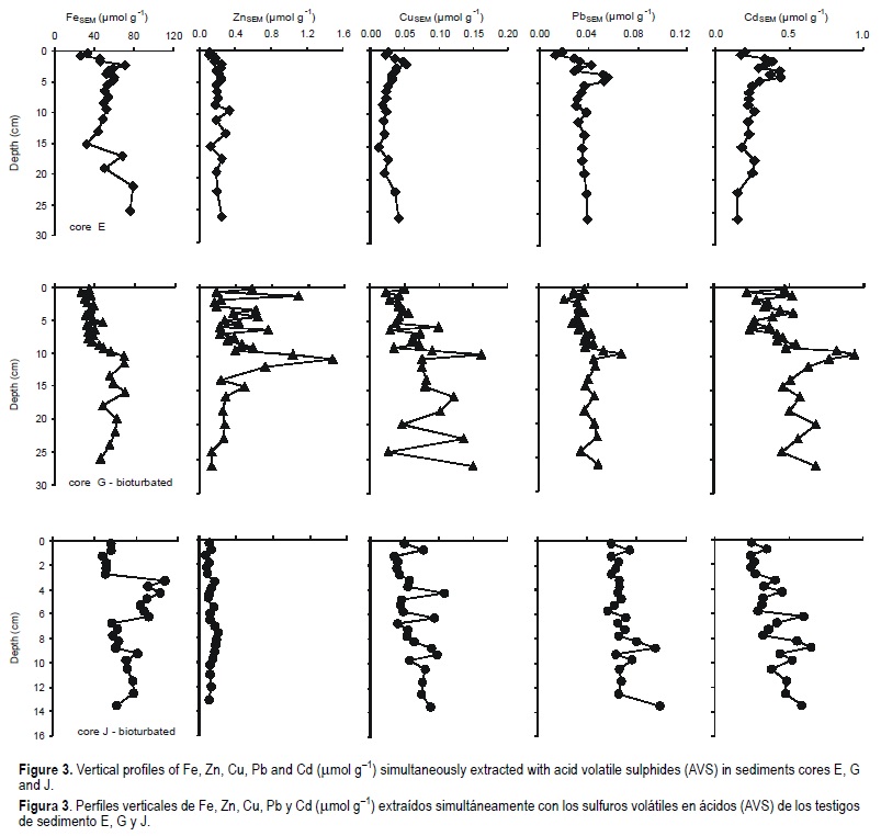 The contrast between the trace metal distributions in cores G and E is striking. The peaks of reactive trace metals in the core bioturbated by macrobenthic organisms (G) occurred deeper in the sediments where AVS presented their first maximum-minimum oscillation with depth. This distribution pattern is extended at least until 30 cm depth. A thicker benthic layer and irrigation mean that dissolved oxygen is pumped deeper into the anoxic zone creating several oxic/anoxic interfaces. The irregular AVS profile and the sharp peak of iron oxides corroborate the dramatic changes occurred inside the sediments. Because inhabitant organisms create these interfaces, this situation is probably in non-steady-state conditions. The net result of several redox boundaries is to mobilize trace metals between oxic/suboxic zones and layers where sulphide is present in a larger sediment volume. This mobilization explains the higher quantities of zinc, copper and cadmium associated with monosulphides in the bioturbated core G. Presumably the intensity of these exchanges is enough to influence the total metal distribution, in the solid fraction of the sediments.