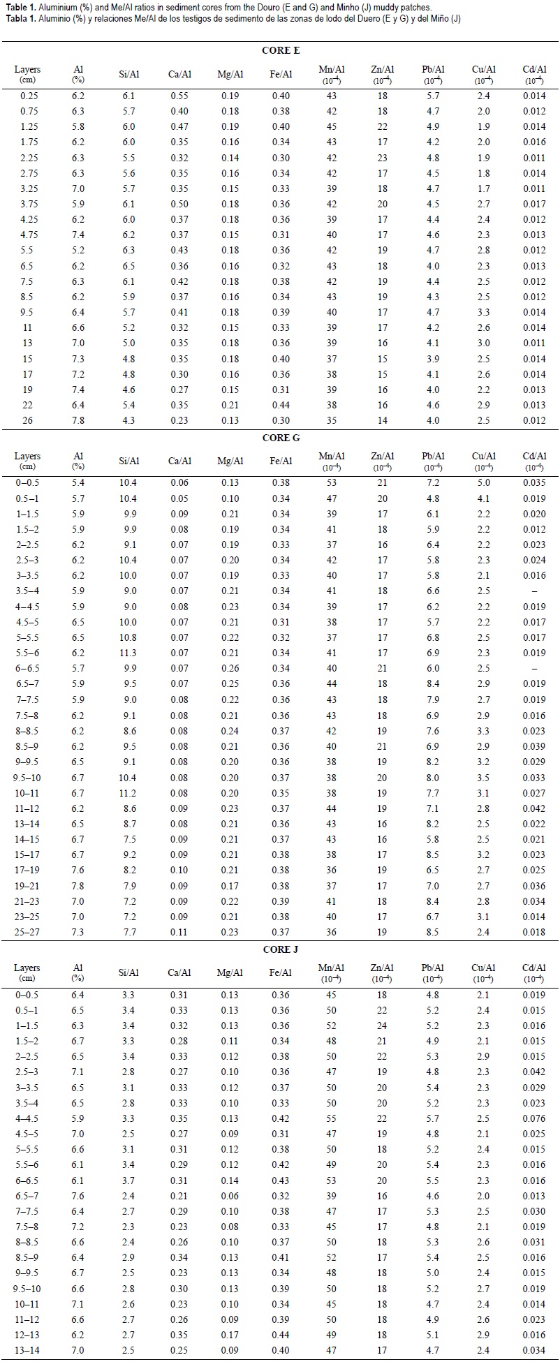 The aluminium concentrations and the major, minor and trace metal ratios to Al of cores E, G and J are presented in table 1. Aluminium concentrations in the three cores were relatively uniform with the depth, generally varying between 6% and 7%. These values are in agreement with the grain size distribution that indicates a stable deposition of fine-grained material in these muddy patches (Drago, 1995). The Fe/Al ratios ranged also in a narrow interval, with a mean value of 0.36 ± 0.031. Values of the Si/Al, Ca/Al and Mg/Al ratios were less uniform, with core G presenting higher Si/Al and lower Mg/Al and Ca/Al ratios. Moreover, Ca/Al and Mg/Al ratios in the 1-cm layer were half of the values found in deeper sediments, which indicates that the material is more siliceous and contains less carbonates. The Mn/Al and Zn/Al ratios were similar in the three cores and did not vary considerably with depth. The slight increase of the Mn/Al ratio in the first 0.5-cm sediment layer of core G could be the result of diagenetic processes (Sundby et al., 1981). A steep Cu/Al ratio gradient was also found in the first 1-cm layer, which can be due to the presence of freshly deposited organic matter derived from the water column. The sharp decrease of the Cu/Al ratio in the first centimetre may also indicate an intense degradation of organic matter. This agrees with the model proposed by Klinkhammer et al. (1982), with most of the copper arriving to the sea floor being regenerated near the interface and released to the water column. This tendency was not registered in the other cores, probably because of lower carbon input to the sediment at those stations. Whereas Cd/Al ratios were almost constant along core E, multiple peaks were recorded in core G and a broad enhancement, between 2 and 4 cm depth, was observed in core J. Increase of total cadmium concentration with the sediment depth is reported by Gobeil et al. (1987, 1997), and it is attributed to post-mobilization and subsequent precipitation as sulphide. Also, Pb/Al ratios were less uniform in core G and most of their values exceeded those found in cores E and J.