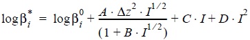 donde βi* es la constante de estabilidad para una fuerza iónica i; βi0 es la constante de estabilidad en agua pura; A depende de la temperatura (0.511 para 25°C); y B, C y D son parámetros de ajuste.