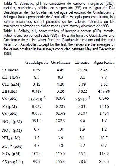 Cabe destacar los elevados valores de pH y carbono inorgánico tanto en el agua del Río Guadalquivir como en la del Guadiamar. De hecho, el Guadalquivir presenta un comportamiento atípico con respecto al sistema del carbono. Así, las concentraciones de carbonato y bicarbonato son incluso superiores a las registradas en agua de mar costera, donde ambas especies son consideradas como mayoritarias. Por otro lado, las concentraciones de nitrato y silicato en ambos ríos también son elevadas.