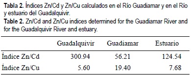 Atendiendo al índice Zn/Cd (tabla 2), el valor del mismo en el estuario está más próximo al registrado en el Río Guadiamar que en el Guadalquivir. Por otro lado, sucede lo contrario en el caso del índice Zn/Cu: el valor del mismo en el estuario está más próximo al encontrado en el Río Guadalquivir que en el Guadiamar. Por tanto, podría decirse que el Zn registrado en el estuario del Guadalquivir provendría de la mina de Aznalcóllar a través del Guadiamar, mientras que parece que el accidente no ha afectado a los niveles de Cu en el estuario.