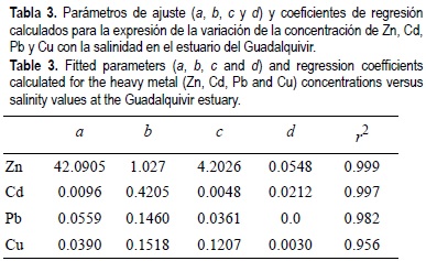 Aunque el comportamiento de estos cuatro metales es no conservativo, el decrecimiento de la concentración de los mismos con la salinidad viene descrito por la ecuación exponencial siguiente: