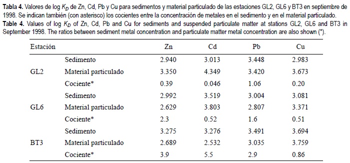En la tabla 4 se muestran los logaritmos de los coeficientes de partición de Zn, Cd, Pb y Cu del sedimento y del material particulado de las estaciones GL2, GL6 y BT3 (fig. 1), en septiembre de 1998. Los valores de KD para el Zn, Cd, Pb y Cu estuvieron comprendidos entre 102 y 104, concordantes con los obtenidos por otros autores en estudios realizados en otros sistemas estuáricos (e.g., Benoit et al., 1994; Wood et al., 1995) y que denotan una clara afinidad de estos metales por la fase sólida. Puede apreciarse que existen notables diferencias entre los KD de sedimento y de material particulado en las distintas estaciones, pudiendo establecerse tres zonas claramente diferenciadas. En la estación GL2, cercana a la desembocadura, los coeficientes de partición del material particulado son superiores a los del sedimento, debido probablemente al descenso del régimen hidrodinámico, que favorece la existencia de partículas de tamaño más fino, con una mayor capacidad de adsorción. En el Brazo de la Torre, los KD del sedimento son superiores a los del material particulado, lo cual puede deberse a su proximidad al punto donde se produjo el accidente minero de Aznalcóllar, y a la existencia de unas condiciones hidrodinámicas más fuertes que favorecen la resuspensión de material particulado de gran tamaño y con menor capacidad de adsorción. En la estación GL6, situada en la confluencia del Brazo de la Torre y del estuario del Guadalquivir, se produce un comportamiento intermedio entre estos dos. Parece ser, por tanto, que las diferencias entre los coeficientes de partición del material particulado y del sedimento están determinadas por las diferencias entre los regímenes hidrodinámicos en cada una de las zonas y la proximidad al punto de vertido. En la tabla 4, se presentan también los cocientes entre las concentraciones de metales en el sedimento y el material particulado. Puede apreciarse que estos cocientes aumentan progresivamente desde la estación GL2 hasta la BT3. En este sentido, cabría destacar el caso del Cu, cuyos cocientes en todas las estaciones son inferiores a la unidad, indicando su mayor afinidad por el material particulado que por el sedimento. Esto se debe al mayor contenido orgánico del material particulado (sólidos volátiles entre 5% y 15% de los sólidos totales) en relación con el de los sedimentos (entre el 0.2% y 1.3%). La afinidad del Cu por la materia orgánica ya ha sido descrita en numerosas ocasiones (e.g., Elbaz-Poulichet, 1994; Tang et al., 2001).