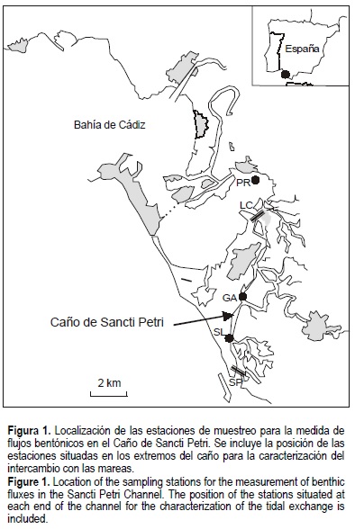 Los flujos bentónicos se han determinado en las estaciones GA, situada en la parte central del caño de Sancti Petri que fue dragado previamente a los muestreos, SL, en un estero de la zona de marismas, y PR, en el saco interno de la bahía. El intercambio de carbono inorgánico y nutrientes con las mareas a través de los extremos del caño se ha caracterizado en las estaciones LC y SP.