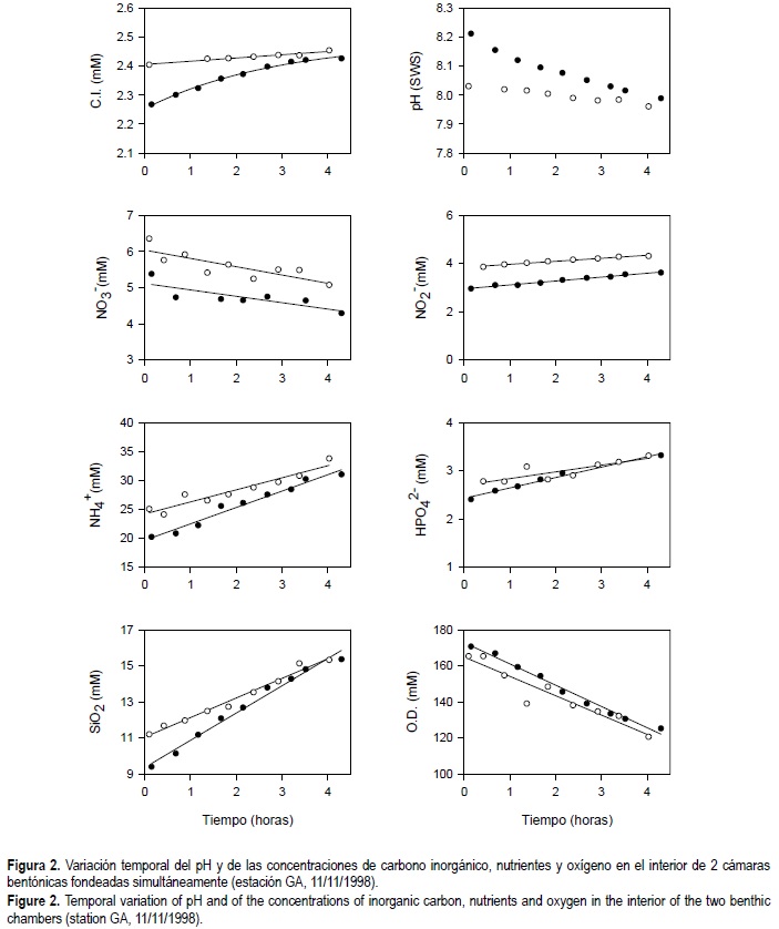 En la figura 2 se muestra la variación del pH y las concentraciones de oxígeno, carbono inorgánico, amonio, nitrito, nitrato, fosfato y silicato durante el fondeo de las dos cámaras bentónicas, y se observa la gran similitud que se ha encontrado entre las dos cámaras empleadas en este trabajo. Puede apreciarse que existe una disminución de la concentración de oxígeno a medida que éste se utiliza en la oxidación aeróbica de la materia orgánica, así como de otras sustancias en estado reducido (e.g., sulfuro) productos de la diagénesis. La concentración de carbono inorgánico aumenta durante la incubación, generalmente acompañado por una disminución de los valores del pH. Las concentraciones de amonio, fosfato y silicato en el interior de las cámaras también aumentaron con el tiempo en todos los muestreos realizados. La evolución de las concentraciones de nitrito y nitrato en las incubaciones son menos intensas que las de amonio, y más variables, produciéndose incluso diferencias en el sentido de los flujos.