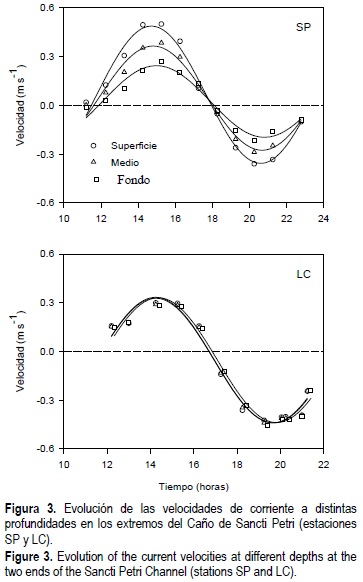 En la figura 3 se muestra la variación de la velocidad de corriente a lo largo de un ciclo de marea en los dos extremos del Caño de Sancti Petri. Como criterio general de signos, tanto para las velocidades de corriente como para las velocidades de transferencia, se han asignado valores positivos a las entradas en el Caño de Sancti Petri desde cualquiera de sus extremos, y negativos para las salidas. Las curvas de velocidad que se han obtenido no son simétricas, lo cual es debido al desfase que presenta la marea en la zona interna de la Bahía de Cádiz (5 minutos) con respecto a la entrada desde el Atlántico. A partir de un balance hídrico entre las entradas y salidas entre ambos extremos, se ha estimado un caudal neto de aproximadamente 80 m3 s-1 desde la estación SP hacia la estación LC. Además, las zonas intermareales que se abastecen de agua a través del Caño de Sancti Petri hacen que la hidrodinámica de esta zona sea muy compleja.