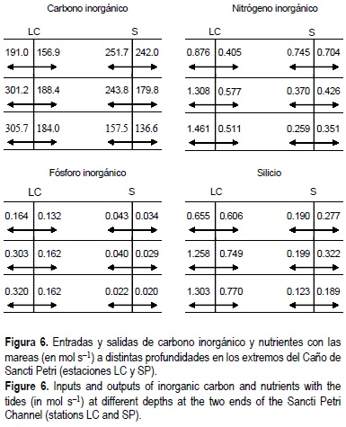 La integración de estas velocidades de transferencia para los periodos de tiempo comprendidos entre una bajamar y la pleamar siguiente, permite establecer las entradas y salidas netas que se producen en el sistema. En la figura 6 se muestran los valores obtenidos para las entradas y salidas en las 3 secciones consideradas de las estaciones LC y SP. En la estación LC el transporte se produce preferentemente en las secciones seleccionadas a profundidad media y en el fondo. Este hecho no indica que exista una estratificación de la velocidad de corriente o de la concentración de los compuestos estudiados, sino que el intercambio se encuentra condicionado por la menor superficie que presenta la sección más superficial (entre 110 y 500 m2), en comparación con las establecidas a profundidad media o en el fondo (455 m2). En esta estación, se ha encontrado una salida neta hacia la Bahía de Cádiz de carbono, nitrógeno y fósforo inorgánicos disueltos, así como de silicio disuelto, en las 3 secciones (superficie, media y fondo) cuando se considera un ciclo completo de marea. Los valores de las entradas y salidas con las mareas en la estación SP son más parecidos que en LC, y el intercambio es más intenso en la sección superficial como consecuencia de la presencia de zonas intermareales. En comparación con LC, cabe destacar las bajas entradas y salidas de nitrógeno inorgánico disuelto, fosfato y silicato a través del extremo sur del caño (SP), motivado por las bajas concentraciones encontradas de estos compuestos.