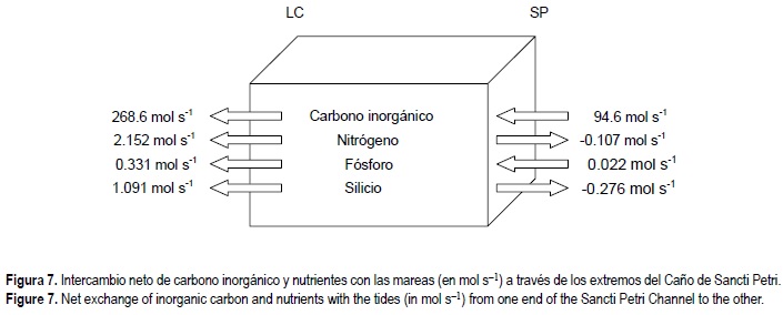En la figura 7 se presenta el balance final entre las entradas y salidas en las dos estaciones. En lo que respecta al carbono inorgánico disuelto, existe una entrada de 94.6 mol s-1 a través de la estación SP y una salida de 268.6 mol s-1 por LC. Por tanto, el conjunto formado por el Caño de Sancti Petri y la zona de marismas circundantes actúa como un sistema productor de carbono inorgánico, posiblemente relacionado con su producción durante la mineralización de la materia orgánica y con la disolución de CaCO3 biogénico en los sedimentos más superficiales (Cai et al., 1995; Mucci et al., 2000). Para el nitrógeno inorgánico disuelto se ha encontrado una salida neta por ambos extremos, fundamentalmente de amonio, aunque la exportación se produce fundamentalmente por la estación LC (2.152 mol s-1). El fósforo inorgánico disuelto presenta una entrada poco importante a través de SP, y una salida de 0.331 mol s-1 por LC. Por tanto, esta zona se comporta como una fuente de N y P, que a su vez es consecuencia del balance entre la producción bentónica, los vertidos en la zona y su consumo por el fitoplancton. El silicio se exporta hacia el exterior a través de los dos extremos del caño, lo cual se encuentra relacionado con los elevados flujos bentónicos que se han medido en la zona (tabla 1).