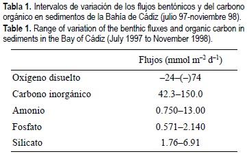 En la tabla 1 se muestran los intervalos de variación de los flujos bentónicos para los distintos muestreos efectuados. Sus valores pueden considerarse altos en comparación con otros sistemas costeros (e.g., Hammond et al., 1985; Dollar et al., 1991; Giordani et al., 1992; Friedrich et al., 2002).