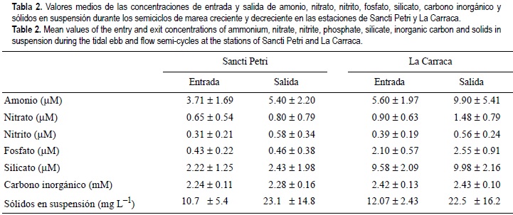 El balance entre las entradas y salidas con las mareas en el Caño de Sancti Petri y su zona de marismas adyacentes muestra una exportación neta de carbono inorgánico y nutrientes, fundamentalmente hacia la Bahía de Cádiz (180 t d-1 de C, 2.73 t d-1 de N, 0.85 t d-1 de P y 3.31 t d-1 de Si). La elevada productividad primaria de la zona (Gómez-Parra y Forja, 1992), los vertidos principalmente de tipo urbano que se producen, así como la compleja hidrodinámica de la red de drenaje de la zona intermareal dificultan establecer la importancia relativa de las fuentes de carbono inorgánico y nutrientes responsables de este intercambio. No obstante, los elevados flujos bentónicos que se han medido en el sistema, y su elevada relación superficie/volumen, sugieren que la producción desde los sedimentos constituye uno de los factores determinantes de su dinámica, y es responsable en gran medida de su carácter de exportador de estos elementos hacia zonas marinas próximas.