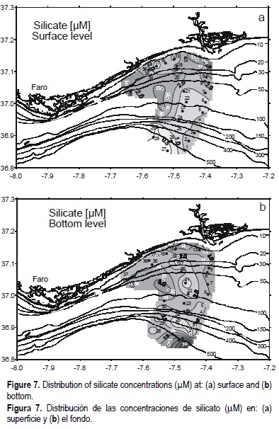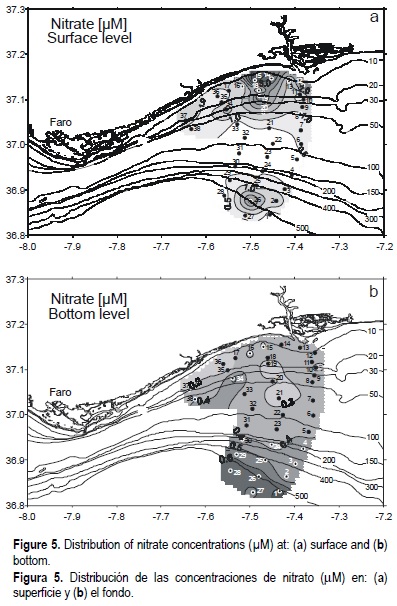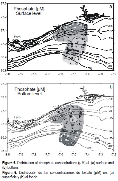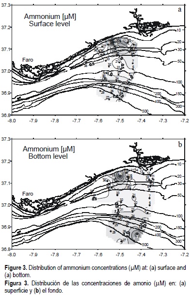 The vertical distribution of nutrient concentrations in the water column with a depth lower than 30 m, showed that concentrations were higher at the surface than at the bottom (figs. 3, 4, 5, 6, 7). This supports the influence of the Guadiana outflow mentioned above. When the water column has a depth greater than 30 m, the nutrient concentrations showed a gradual increase with depth, mainly due to the uptake of nutrients by phytoplankton at the surface and remineralization in the water column (Saad and Hassan, 1994; Vukadin and Stojanoski, 1996; Padmavathi and Satyanarayana, 1999).