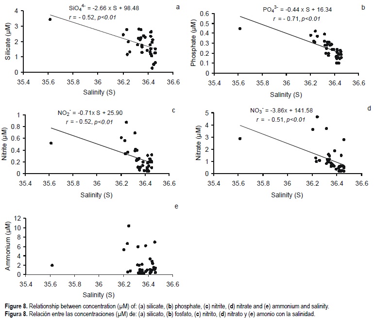 One of the major input of nutrients in coastal areas are river discharges (Valiela et al., 1991; Rabalais, 1996); however, the extension of river discharges depends on the volume of water that reaches the coastal zone (variability of the river discharge regime) and on its spread in the coastal zone. Areas that are markedly influenced by river discharges show evident nutrient gradients along with changes in salinity. Nutrient concentrations in these areas are much higher than in the adjacent open seas and decrease as salinity increases, tending to behave conservatively in rapidly flushed estuaries (Balls, 1994). This is particularly evident during winter, when little or no loss of nutrients through phytoplankton consumption was expected, due to their minimal activity (Cruzado and Velasquez, 1990). The conservative mixing of nutrients is a function of the estuarine flushing time that controls the extent to which internal processes (biological and abiotic) can modify nutrient inputs. Significant negative relationships are usually found between nutrient concentrations and salinity in a wide range of salinity, in which nutrient concentrations are higher at lower salinity. In these cases, the nutrient used as the best freshwater tracer is silicate (Hunt and Foster, 1977, 1985). The relationship between surface nutrient concentrations and salinity is presented in figure 8. Significant relationships exist between nutrient concentrations and salinity although the correlation coefficients between variables were relatively low (P < 0.01) (fig. 8). This was attributed partly to the small amplitude of salinity associated with the reduced influence of the Guadiana outflow. However, in this study silicate was not the best tracer to identify the presence of freshwater input. The nutrient that showed the highest conservative behaviour was phosphate (r = -0.71; fig. 8b). Some departure from the theoretical dilution line was observed for those points that were off the regression line, which corresponded to samples in the area directly influenced by the freshwater discharge (stations 12, 13, 14, 15, 19; fig. 2). That possibly resulted from the inherent chemical behaviour of the mixing waters in combination with an in situ non-conservative biological (phytoplankton consumption) behaviour. These relationships are also conditioned by the minimum salinity value (S = 35.6) and consequently they must be interpreted with caution. In fact, if this value is not taken into account, both silicate and ammonium concentrations did not present a conservative behaviour (fig. 8), whereas for the phosphate, nitrite and nitrate concentrations, the correlation coefficients increase with salinity (r = -0.81, r = -0.66 and r = -0.57, respectively). Nevertheless, for more reliable information about the mixture of fresh and marine waters in this area in order to determine the dilution effect upon coastal waters, a wider range of salinity must be covered.