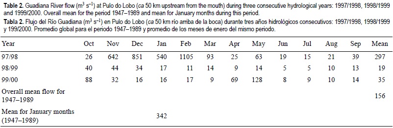 The ranges of nutrient concentrations were not significantly different when compared with others obtained in similar flow conditions along the Guadiana estuary (tables 1, 3), particularly in its lower part (-12 km upstream from the mouth), between October 1996 and March 1998 (Chícharo et al., 2001; Rocha et al., 2002; table 3). However, the differences are evident when periods of high flow were compared, as was the case of December 1997 (table 3). Consequently, the nutrient concentrations in this study are typical of the winter months of low river flow discharge.