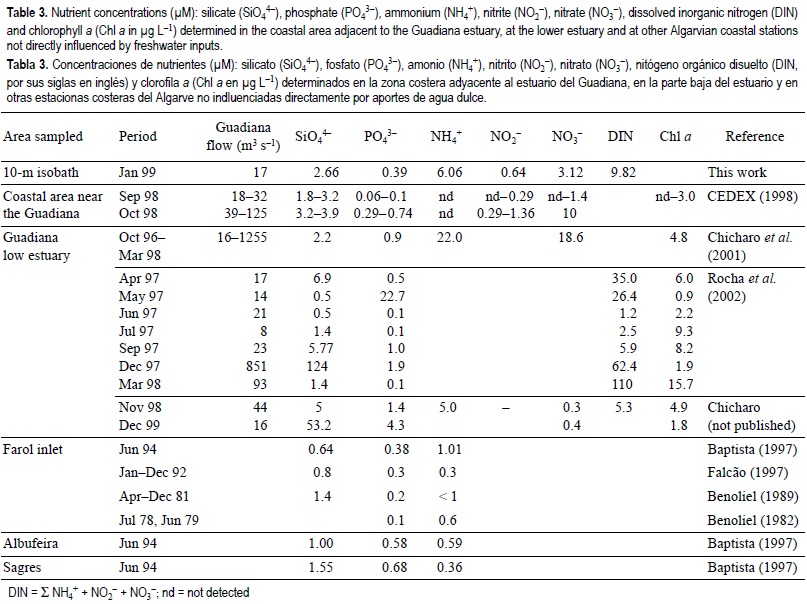 The ranges of nutrient concentrations obtained in the present work were of the same order of magnitude as those found in the coastal area adjacent to the Guadiana outflow in September and October 1998 (CEDEX, 1998), when the flow was 18-32 m3 s-1 (considered small, typical of summer conditions) and 39-125 m3 s-1 (typical of winter conditions), respectively. With a higher outflow (November 1998), except for ammonium, all the other maximal nutrient concentrations were higher than the ones obtained in this work (tables 1, 3).