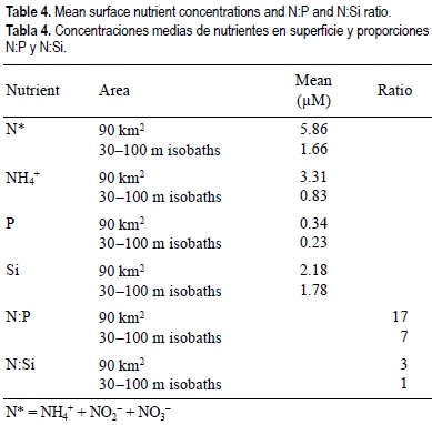 During this study, in the area of the Guadiana outflow influence, the N:P and N:Si ratios calculated were 17 and 3, respectively (table 4). These ratios support the assumption that the N compounds were in excess and showed that P and Si were the limiting elements. Surface nutrient concentrations decreased with the increase in distance from the coast. This was observed at stations with a water column depth greater than 30 m where salinity increased, reaching values of 36.4. This is due to the two component mixing system, mixture of freshwater with seawater (Coste et al., 1987; Cruzado and Velasquez, 1990; Lefevre et al., 1997). The N:P and N:Si ratios at the surface decreased from 17 to 7 and from 3 to 1, respectively (table 4), over the isobaths between 30 and 100 m, indicating that in the water mass between those isobaths, N was the limiting element. This is usual in typical marine waters. However, surface nutrient concentrations were generally lower than in the areas over the isobath greater than 100 m. This can indicate that the primary production in that area was more important than in more remote stations. However, the effect of the alteration of the nutrient ratios upon the phytoplankton assemblages was not studied.