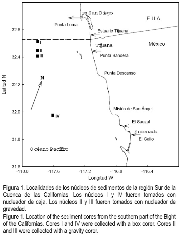 El área de estudio se sitúa entre los 31°50' y 32°26' N y los 117°24' y 117°44' W (fig. 1). Su topografía es accidentada, presentando cuencas y cañones submarinos que actúan como trampas de sedimentos finos y de material particulado provenientes de aguas de escurrimiento, de descargas o de actividades de dragado. Algunas de estas cuencas se encuentran completamente cerradas o semicerradas, lo que le confiere a la zona una circulación característica (Niiler et al., 1989; Bookman, 1990; Dailey et al., 1993).