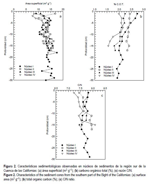 Los perfiles del carbón orgánico total (COT) se muestran en la figura 2b. Los porcentajes de COT fluctuaron entre 1.56 y 2.73. La uniformidad en los perfiles, tanto de COT como del área superficial, puede estar relacionada con un flujo constante de material particulado relativamente homogéneo en tamaño y composición de COT. La baja correlación entre el área superficial y el porcentaje de COT (r2 = 0.06 a 0.48) puede deberse a la poca variabilidad del área superficial y a una relativa degradación del material orgánico después de su depositación, tal como lo sugiere el comportamiento del COT con la profundidad (fig. 2b).