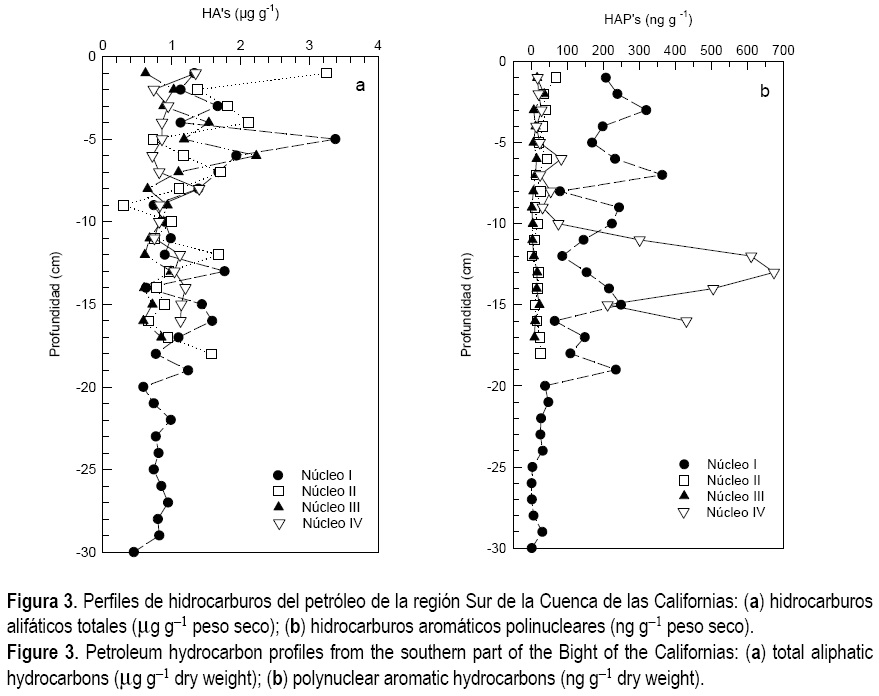 Las concentraciones de HAs fluctuaron entre 0.3 a 3.38 µg g-1 (fig. 3a). Las concentraciones más altas de HAs se encontraron en el núcleo I. Sin embargo, los valores encontrados en este estudio son bajos cuando se comparan con los encontrados en algunas cuencas, como Santa Bárbara y Santa Mónica, en el sur de California, pero similares a los reportados para sedimentos costeros de Baja California y sedimentos profundos de Norteamérica y Europa (Farrington et al., 1977; Venkatesan et al., 1980, 1987; Cranwell y Koul, 1989; Kennicutt y Brooks, 1990; Steinhauer y Boehm, 1992; Wakeham, 1996; Macías-Zamora, 1996; Macías-Zamora et al., 1997; Tran et al., 1997).