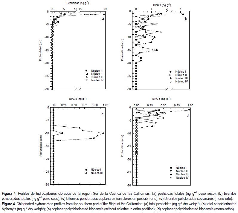 La concentración de pesticidas totales osciló entre 0.09 a 19.71 ng g-1. Las mayores concentraciones se encontraron en el primer centímetro del núcleo III (fig. 4a). Sus concentraciones fueron de 2 a 3 órdenes de magnitud más bajas que las reportadas para sedimentos superficiales de Palos Verdes y las Cuencas de San Nicolás y San Pedro, pero del mismo orden de magnitud que las reportadas para la Bahía de San Francisco, California, y para sedimentos profundos de los E.U.A. (Venkatesan et al., 1980, 1987). Sus bajas concentraciones, pueden relacionarse con una mayor distancia a la fuente.