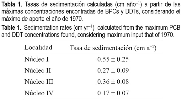 La estratigrafía se realizó utilizando como marcadores moleculares a los BPCs y DDTs, para lo cual se consideró el máximo subsuperficial para 1970 y una velocidad de sedimentación constante, estimándose tasas medias de sedimentación entre 0.17 cm año-1 y 0.55 cm año-1 (tabla 1). Estos valores fueron consistentes con los obtenidos por otras técnicas. En áreas cercanas a la región de estudio, se han reportado tasas de sedimentación que varían entre 0.27 y 0.9 cm año-1 para las Cuencas de San Clemente, Santa Catalina, Santa Bárbara y San Pedro, California (Hom et al., 1974; Bertine y Goldberg, 1977; Schmidt y Reimers, 1991), y valores tan bajos como 0.12 cm año-1 para sedimentos más someros en la parte mexicana de esta cuenca (calculados por la técnica del 210Pb; Nava-López, com. pers.).