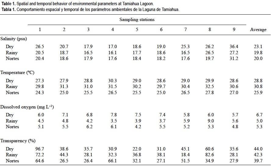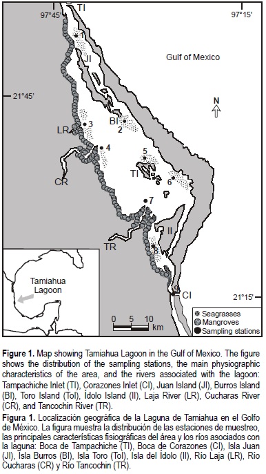 Tamiahua Lagoon is located in the western part of the Gulf of Mexico (21°06'-22°05' N, 97°23'-97°46' W). It is the largest coastal lagoon in the state of Veracruz (Mexico), with a surface area of 880 km2, and a maximum length and width of 100 and 25 km, respectively. The lagoon is shallow, with a mean depth of 2.5 m and a mean tide range of 0.20 m. It is connected to the sea via two tidal passes, Tampachiche Inlet to the north and Corazones Inlet to the south, and receives the discharge of several rivers: Laja, Cucharas, Carbajal, Tancochin, and Tampache (fig. 1). The climate is Aw2, tropical subhumid, with rains in summer (García, 1988). There are three climatic seasons: the dry season from March to May; the rainy season from June to October, characterized by conventional rains; and the winter storm ("Nortes") season from November to February (Castillo-Rivera and Kobelkowsky, 1993; De la Lanza et al., 1998). There are a number of different aquatic environments in the lagoon system, including brackish and low salinity mangrove swamps, seagrasses, areas of high sedimentation, oyster reefs, and a mesohaline to polyhaline central basin. More details about this lagoon can be found in the work of Contreras-Espinosa (1993).