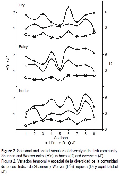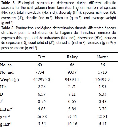 The lowest values for diversity and abundance were recorded during the Nortes season, with 56 species (table 3). During this time of the year, the different habitats of the system are used by a great number o species, including areas of seagrasses and mangrove systems, the inlets and adjacent continental shelf. Few abundant species were recorded during this time of the year. The average weight per individual of the populations was also small (6.2 g ind-1) due to the decrease in numerical abundance during the Nortes season. The most abundant and frequent species during this season were Anchoa mitchilli, Ariopsis felis (Linnaeus, 1766), Baridiella chrysoura, Eucinostomus argenteus (Baird and Girard, 1855), Hyporhamphus roberti, and Membras vagrans. The behavior of these species has been observed in other tropical ecosystems by Díaz-Ruiz et al. (1982), Chavance et al. (1984), Aguirre-León and Yáñez-Arancibia (1986), Yáñez-Arancibia and Lara-Domínguez (1988), and Aguirre-Léon and Díaz-Ruiz (2000). Other species use the lagoon as a temporary feeding and protection area, such as Archosargus probatocephalus (Walbaum, 1792), Diapterus auratus, Harengula jaguana (Linnaeus, 1758), Lutjanus griseus (Günther, 1870), and Opsanus beta (Goode and Bean, 1882). The species Anchoa lyolepis (Evermann and March, 1902), Baridiella chrysoura, Eucinostomus gula (Quoy and Gaimard, 1824), Eugerres plumieri (Cuvier, 1830), Diapterus rhombeus (Cuvier, 1829), and Orthopristis chrysoptera (Linnaeus, 1766) use the system as an area of protection and/or maturation.