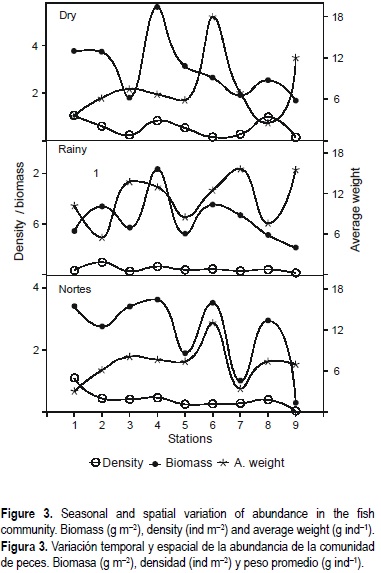 The highest number of fishes, 9337 (40.6%), was captured during the rainy season, while 7734 individuals (33.6%) were caught during the dry season and 5913 (25.7%) during the Nortes season. The total biomass taken was 174,369 g, of which 94,894 g (54.4%) were obtained in the rainy season, and 42,975 g (24.6%) and 36,500 g (20.9%) in the dry and Nortes seasons, respectively. Biomass per unit area was higher in the rainy season, with 59.3 g m-2, and lower during the Nortes, with 22.8 g m-2. The highest value, 12.5 g m-2, occurred at station 6 during the rainy season and the lowest, 0.30 g m-2, at station 9 during the Nortes. According to ANOVA, significant differences were found for the biomass. The Tukey test showed that the differences were between the dry and rainy seasons, and between the rainy and Nortes seasons (P < 0.00113). Density showed a similar pattern, with the highest value, 5.84 ind m-2, during the rainy season and the lowest, 3.7 ind m-2, during the Nortes. The highest density, 1.5 ind m-2, was recorded at station 2 in the rainy season and the lowest, 0.14 ind m-2, at station 9 in the dry season (table 3, fig. 3). The average weight per fish showed a similar pattern to biomass and inverse to that of density. The highest average weight per fish, 10.2 g ind-1, occurred in the rainy season, and the lowest value, 5.6 g ind-1, in the dry season. Spatially, station 4 had the highest average weight, 18 g ind-1, and station 8 the lowest one, 2.6 g ind-1, both during the dry season (table 3, fig. 3). The statistical analysis did not show any significant differences among seasons for density and average weight (P > 0.2981).