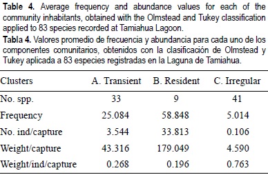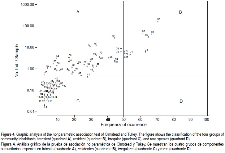 Figure 4 shows the annual distribution of the community inhabitants using the Olmstead and Tukey classification quadrants, and table 2 lists the species with their corresponding number in that figure. Based on this analysis, there were 9 resident species (quadrant B), 33 seasonal transients (quadrant A), 41 irregular visitors (quadrant C), and no rare species (quadrant D). The resident species were, in order of importance, Anchoa mitchilli (Valenciennes, 1848), Membras vagrans (Goode and Bean, 1879), Hyporhamphus roberti (Cuvier, 1846), Bairdiella chrysoura (Lacepéde, 1832), Eucinostomus melanopterus (Bleeker, 1863), Strongylura notata (Poey, 1860), Mugil curema Valenciennes (1836), Achirus lineatus (Linnaeus, 1758), and Cynoscion nebulosus (Cuvier, 1830). Table 4 also shows the average values of several parameters of abundance relative to the number of captures made, for each of the groups obtained with the above classification.
