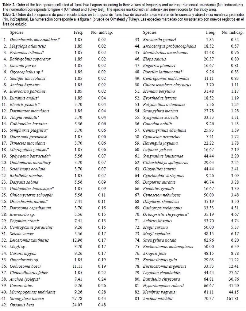 In this study, 83 species were identified, of which 14 were new records for the study area. The total number of species reported for Tamiahua Lagoon by other authors plus those identified in this study is 136, which represents 42.76% of the 318 species reported by Reséndez and Kobelkowsky (1991) for 13 lagoon systems of the Gulf of Mexico. For the study area, the works of Reséndez and Kobelkowsky (1991) and Franco-López and Chávez-López (1992) reported a combined list of 122 species. Based on the results for Tamiahua Lagoon, as well as elsewhere in the southern Gulf of Mexico, we believe that further effort in this lagoon would result in the capture of additional species, in terms of additional habitat type studied. These understudied areas include submerged vegetation patches, the intertidal margins of mangrove forests of the lagoon basin, and swamp zones and flood plains with freshwater influence. In this respect, Miller (1986) considers that the basins of the Pánuco and Tuxpam rivers and their tributaries (that bound the study area) are important centers of dispersion and endemism for the freshwater fish fauna. Many of these species have the capability to inhabit brackish waters and invade lagoon areas. Also, it is probable that species of marine affinity found in other lagoon systems of the southern gulf also inhabit Tamiahua Lagoon. We assume this because the Tampico-Cabo Rojo-Tuxpam coastal area (covering the entire Tamiahua basin) is regarded as a zoogeo-graphic transition zone of fish communities of the Carolinean (to the north, with temperate-warm components) and the Caribbean (to the south, with subtropical-tropical components) marine provinces (Castro-Aguirre et al., 1986). Tamiahua has the third highest number of fish species of the Mexican coast of the Gulf of Mexico, after Términos Lagoon, with 216 species (Reséndez and Kobelkowsky, 1991; Yáñez-Arancibia et al., 1988), and Tuxpam-Tampamachoco, with 179 species (Pérez-Hernández and Torres-Orozco, 2000).