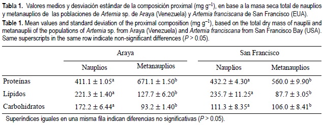 Se encontraron diferencias significativas (P < 0.05) entre los estadios, siendo el metanaupliar el que presentó mayores concentraciones de proteínas, pero menores de lípidos y carbohidratos, mientras que entre las poblaciones no se evidenciaron diferencias significativas (P > 0.05). Los valores de proteínas en los metanauplios fueron de 67% y 56% y en los nauplios de 41% y 43%, para las poblaciones de Araya y San Francisco, respectivamente; en contraste con los lípidos y carbohidratos para los que el estadio naupliar mostró valores de 22-23% y 11-17%, respectivamente, mayores que los de los metanauplios que presentaron 8-13% de lípidos y 9-11% de carbohidratos (tabla 1). La mayor proporción de proteínas en los metanauplios y menor de lípidos en la nauplios tambián ha sido reportada en diferentes poblaciones de Artemia (Helfrich, 1973; Benijts et al., 1976; Claus et al., 1979; Láger et al., 1986; Hoff y Snell, 1993). Dichos resultados sustentan la hipótesis de la acumulación de proteínas para efectos estructurales y energáticos en estadios avanzados, más que de lípidos, los cuales son utilizados en las fases más tempranas como la naupliar. Evidentemente los nauplios presentan mayores concentraciones de lípidos que los metanauplios, ya que ástos representan la forma de energía disponible para las primeras horas de vida, ya que en esta etapa los organismos carecen de un aparato digestivo funcional (Katavic et al., 1985; Láger et al., 1986). En contraste con la diferencia en la composición bioquímica entre estadios, la no existencia de diferencias significativas entre poblaciones, sugiere una misma tendencia de uso energático y estructural de las macromoláculas en las poblaciones estudiadas.