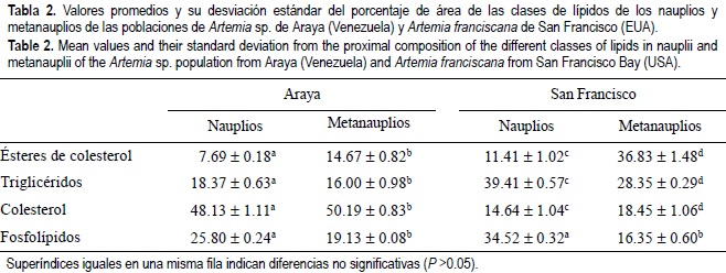 Las diferentes clases de lípidos presentaron diferencias significativas tanto entre estadios como entre poblaciones (P < 0.05), excepto los fosfolípidos, los cuales sólo presentaron diferencias significativas entre estadios. De esta manera, las mayores concentraciones de triglicáridos y fosfolípidos se determinaron en los nauplios, mientras que el colesterol y los ásteres de colesterol fueron mayores en los metanauplios. Navarro et al. (1991), al analizar una población de Artemia procedente de España, obtuvieron resultados similares para el colesterol, mientras que para los fosfolípidos los valores mayores estuvieron presentes en los metanauplios. La población de San Francisco posee mayor concentración de ásteres de colesterol, triglicáridos y fosfolípidos, pero menor de colesterol que la población de Araya (tabla 2). La disminución de las concentraciones de triglicáridos presumiblemente refleja su utilización como combustible metabólico y/o para la biosíntesis de los fosfolípidos (Schauer et al., 1980; Navarro, 1990).