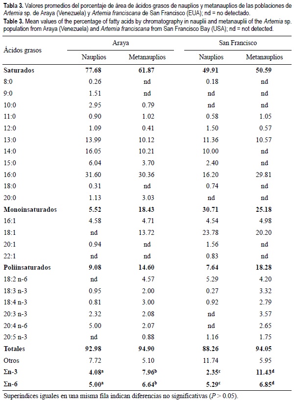 Los análisis de los ácidos grasos (tabla 3) revelaron que, en ambas poblaciones, la mayor proporción estuvo conformada por ácidos grasos saturados, seguida por la de monoinsaturados y polinsaturados. Los porcentajes de los ácidos grasos n-3 y n-6 presentaron diferencias significativas (P < 0.05) entre estadios y entre las poblaciones analizadas, siendo ástos más abundantes en los metanauplios de la población de San Francisco. Láger et al. (1986) reportaron que, en Artemia, el 80% de los ácidos grasos estaban conformados por el 16:0, 16:1, 18:1, 18:2n-6, 18:3n-3 y el 20:5n-3. Todos estos ácidos fueron detectados en ambas cepas y conformaron el 37% y 56% en nauplios y metanauplios para la población de Araya, mientras que para la población de San Francisco representaron proporciones mayores (51% y 64%, respectivamente). En este contexto, para los nauplios de la población de San Francisco, Wickings (1972) encontró valores de 79%, Benijts et al. (1976) reportaron 80% y Claus et al. (1979) 89%. Para otras poblaciones Webster y Lovell (1990) determinaron concentraciones entre 60% y 63% en nauplios de Artemia de China, Colombia, Great Salt Lake (EUA) y en la población de San Francisco (EUA). Se observa que muchos reportes presentan diferencias notables aún analizando las mismas poblaciones de Artemia, lo cual ha sido atribuido, principalmente, a la metodología empleada en la determinación de dichos ácidos grasos, aunada a la variabilidad genática de la Artemia y/o a posibles diferencias en las condiciones ambientales de las zonas geográficas de origen de las poblaciones (Schauer et al., 1980).
