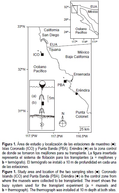 En este estudio se seleccionaron dos sitios para el trasplante (fig. 1). La primera estación se ubicó 10 km al sur de la frontera México-EUA, en la zona sur de las Islas Coronado (ICO; 32°22'30" N y 117°14'00" W). La segunda estación se situó 110 km al sur de la frontera México-EUA, frente a Punta Banda (PBA; 31°43'50" N y 116°43'45" W). La posición de estos dos sitios fue elegida debido a que en ambos el fenómeno de surgencia ocurre con diferente intensidad.