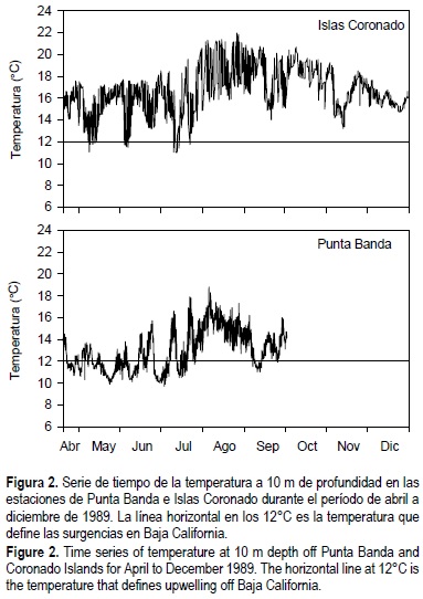 La figura 2 muestra las series de tiempo de la temperatura a 10 m de profundidad de abril a septiembre de 1989 en PBA, y de abril a diciembre de 1989 en ICO. Las series de tiempo de ambas localidades muestran claramente los eventos de surgencia caracterizados por la disminución abrupta de la temperatura. En ambas localidades de abril a julio se presentan las temperaturas más bajas, apreciándose para PBA periodos y pulsos con decrementos de temperatura por debajo de los 12°C, caracterizados por disminuciones hasta los 9.9°C y 9.7°C durante mayo y julio (fig. 2), respectivamente. Sin embargo, para la serie de tiempo de ICO, los periodos de baja temperatura por debajo de los 12°C son menos que los de PBA y los cambios abruptos de temperatura sólo llegan hasta los 11.5°C, ocurriendo éstos durante mayo, junio y julio (fig. 2). Los registros de bajas temperaturas tuvieron duraciones entre 4 y 11 días.